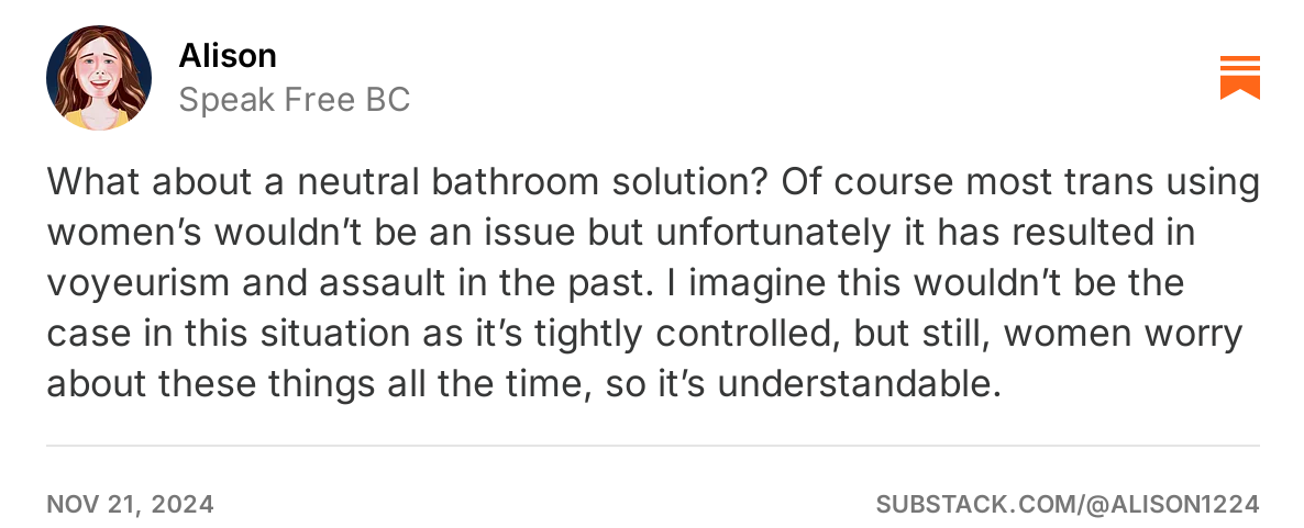 At first glance, Alison's words might seem reasonable. They start by suggesting a "neutral bathroom solution" and qualifying that "most trans using women's wouldn't be an issue." But let's take a closer look at how they are twisting language to introduce anti-trans talking points while trying to maintain plausible deniability.