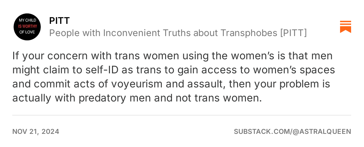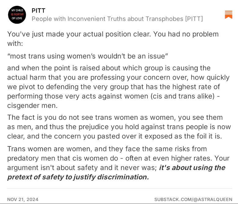 In my response I wanted to peel back the layer of “concern” to see what would be exposed. So I pointed out a crucial flaw in their logic: If their real concern was predatory men taking advantage of trans-inclusive policies, then the problem isn't with trans women at all.6