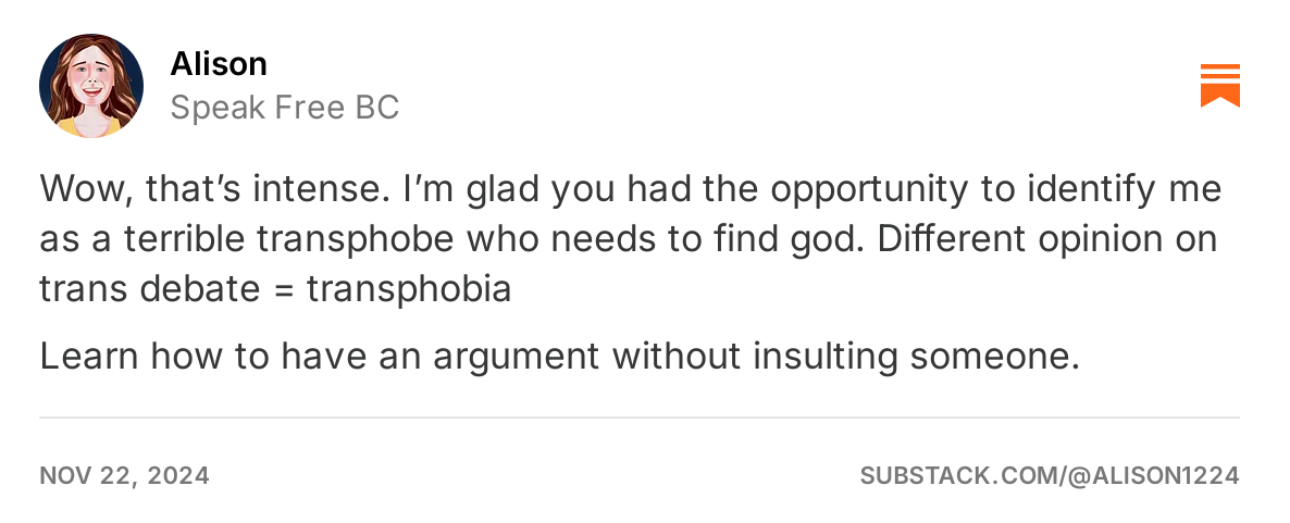 So this makes things quite clear, most of the layers of “reasonable concern” were peeled away successfully, and now we get to see Alison for who and what they are. Alison abandons any pretense of allyship or concern, instead going all-in on anti-trans ideology. Let's unpack what's happening in this mask-off moment.
