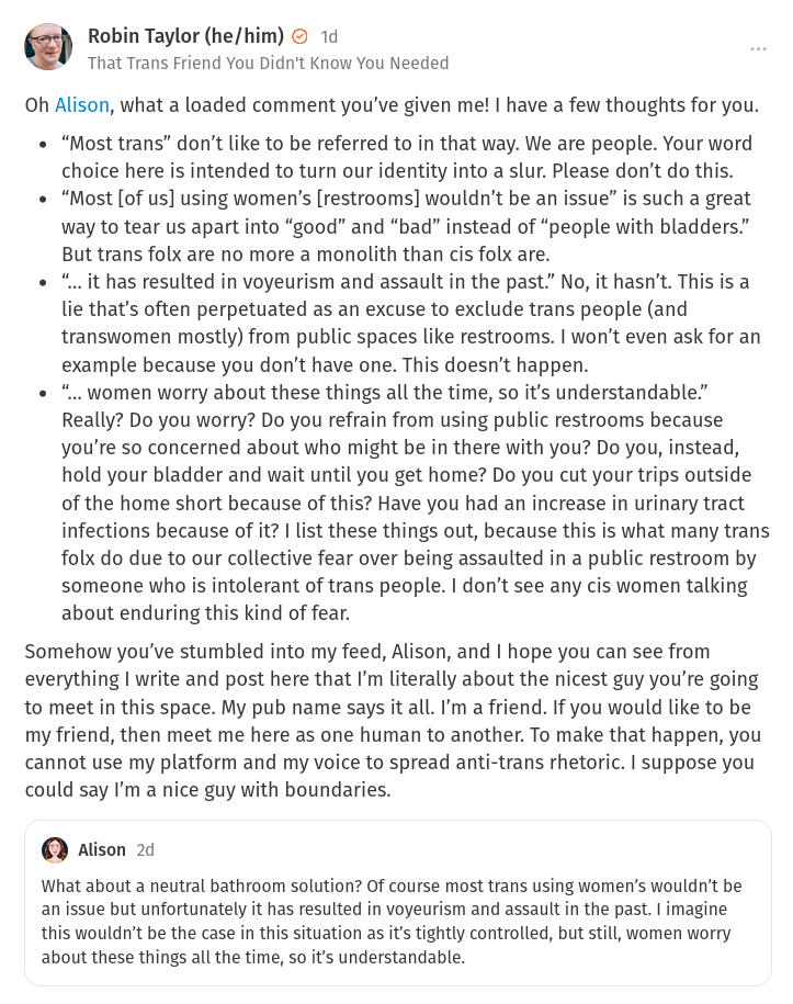 The next part of Alison's comment is an outstanding example in smooth and subtle concern trolling3. They say they imagines assault "wouldn't be the case in this situation" because it's "tightly controlled." So even in hypothetically acknowledging the safety of a particular situation, the underlying message is that trans people are inherently dangerous unless they're under surveillance. The subtle distancing language of "I imagine" also allows Alison to float this transphobic implication while evading direct responsibility for it. This seems almost reasonable except…