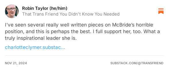 Robin shows us that kindness is really hard to hate. We can all learn a lesson from this, myself included. Patient and polite as I am, even I can come across a bit brusque sometimes - this serves as a welcome reminder that we can do better. For some basic tips on how to identify and deal with TERFs, along with a nice reading list, the University of Cambridge’s Student Union guide on “How To Spot TERF Ideology 2.0” (PDF) is a good, basic start.