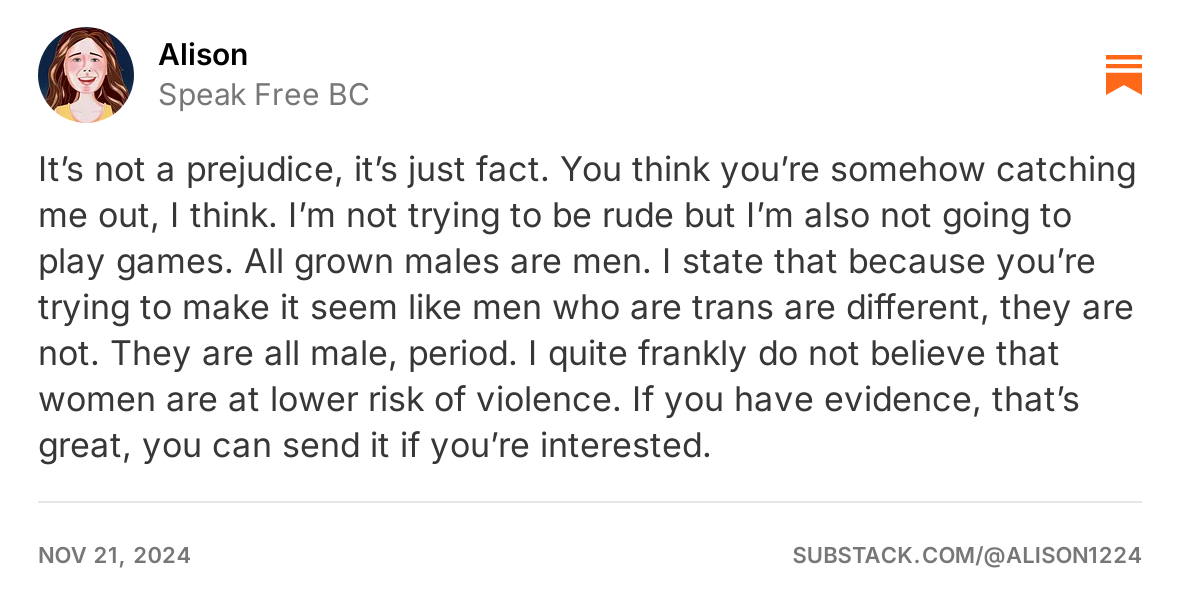 Taken together, this comment is mask-off transmisia. Alison has abandoned any pretense of "just asking questions" or "protecting women" in favor of overt anti-trans rhetoric. Alison has made it crystal clear that they do not see trans women as women, do not believe they face violence (or at least at an increased risk/rate), and is not interested in facts that challenge their bigoted worldview, as we will see later.