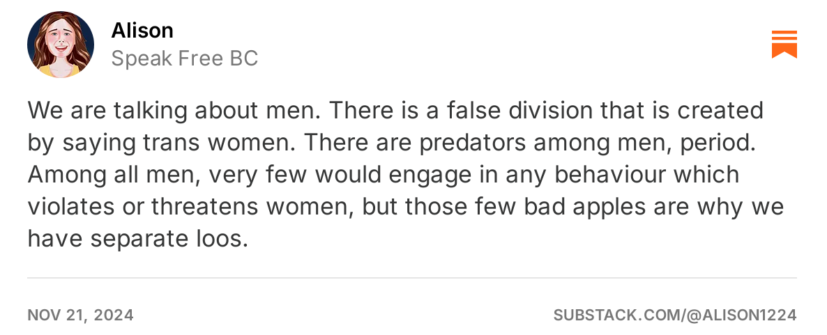 First, notice how Alison completely conflates trans women with men. In one fell swoop, they deny the womanhood of all trans women, insisting "we are talking about men." This is blatant, unabashed transmisia. Alison doesn't see trans women as women at all, and when we take this comment in context of their previous remarks, it is clear that they see trans women as deceptive men invading women's spaces.
