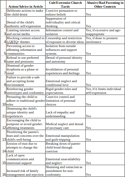 By organizing the information in this way, the table provides a clear and concise comparison between the parenting practices promoted in the essay and the harmful, manipulative tactics used by cults and extremist groups. It also underscores the idea that these behaviors are not unique to the context of gender identity but are widely recognized as abusive and detrimental to a child's development and well-being.