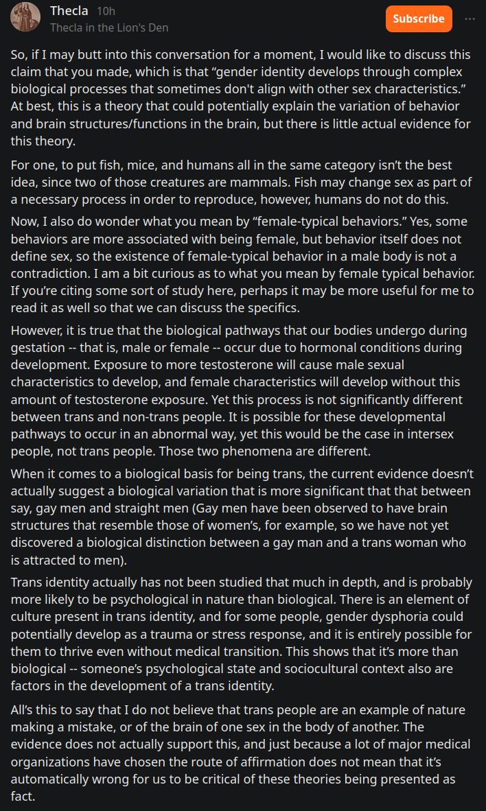 I took this in good faith, this person, though self labeled as a “gender critical feminist” (a contradiction in terms, to be sure) but was polite, rational, and seems to really want to engage in good faith. A rare thing to be sure, and one I both appreciate and respect. So I wrote this rather long response, which I thought would bring value to this section if for no other reason than to show what a more rational discourse on nuanced topics can look like.