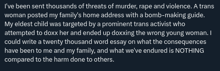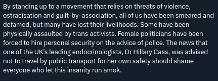 “But endlessly unpleasant as its constant targeting of me has been, I refuse to bow down to a movement that I believe is doing demonstrable harm in seeking to erode ‘woman’ as a political and biological class and offering cover to predators like few before it.”35