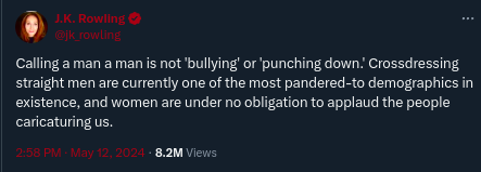 Rowling, J. K. [@jk_rowling]. (2024, December 2). The rewriting of history begins. Opponents of gender ideology haven't merely 'endured unsparing criticism.' I haven't simply been told I 'betrayed real feminism' or received a few book-burning videos [Tweet]. Twitter. https://twitter.com/jk_rowling/status/1863579675877884385 ↩
