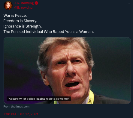 Rowling begins by denying the impact of her own words, instead painting herself as the victim of "unsparing criticism" simply for "disagree[ing] with denying any relationship between sex and biology."19 This framing obscures the reality that Rowling has spread inflammatory misinformation, such as claiming that transgender activists are "denying the existence of sex" and referring to inclusive language as "newspeak" through her invocation of Orwell’s famous 1984 The Party slogans. 20