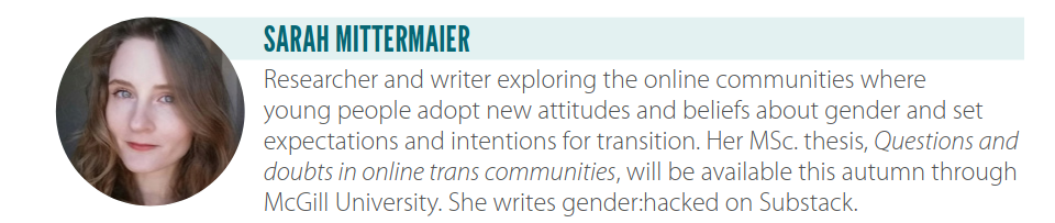 [17] Mittermaier, S. (2024). Questions and doubts in online trans communities. [master's thesis] McGill University. https://escholarship.mcgill.ca/concern/theses/m326m754q?locale=en