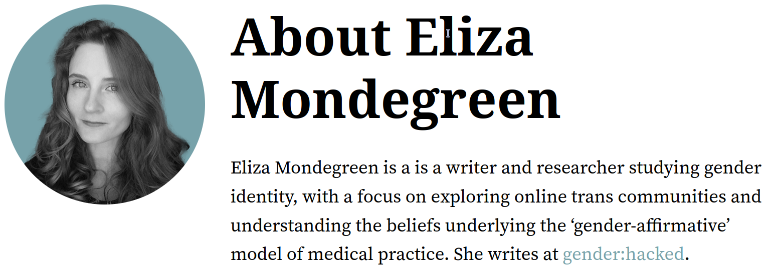 Here I feel compelled to discuss this quote of Mondegreen by Shultz a bit further, because we needs must consider the source of Shultz’s quote - Sarah Mittermaier a.k.a. Eliza Mondegreen. I believe this to be an important aside, because ‘Eliza’ is often quoted as if they are citing a credible expert on transgender healthcare, so this warrants critical examination.