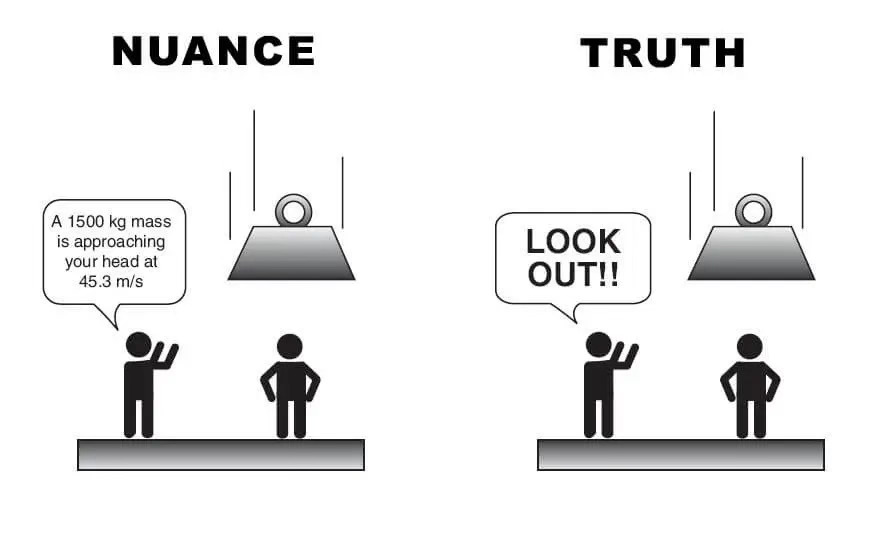 But before we dive into this pool of contradictions deeper than a philosophy major’s thesis, let’s talk about that header graphic. You know, the one that shows nuance as someone calculating the physics of an approaching object while “truth” is just yelling “LOOK OUT!!”