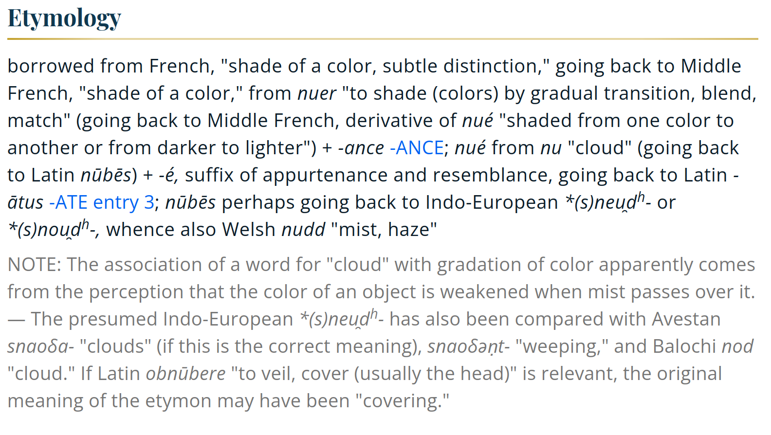Yes, Clark is technically correct that "nuance" can be traced back to the Latin "nubes" (cloud). But here's the deliciously ironic part they left out: "Nuance" actually comes to us from French, where it means "shade of a color, subtle distinction"[6, 12]. The word evolved from describing how colors blend and transition gradually - from "nuer," meaning "to shade colors by gradual transition, blend, match."