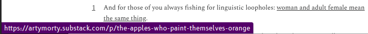 The first footnote baldly asserts that "woman" and "adult female" are synonymous, without evidence or argument. This is a link to another one of Morty’s articles, and will be the subject of a future article debunking this reference. It seems that trans people are not the ones that do not know what a woman is after all.17