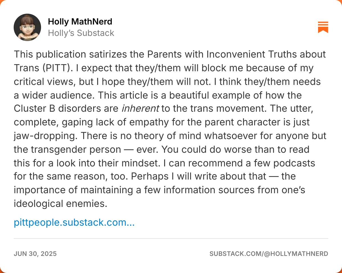 Consider the following: My satire held up a mirror to parents who refuse to see their trans children. Holly gazed into that mirror and saw... what, exactly? A parent so wrapped up in their own narrative they can't recognize their child's reality? Someone whose "concern" masks willful ignorance? A person who mistakes their discomfort for their child's problem?